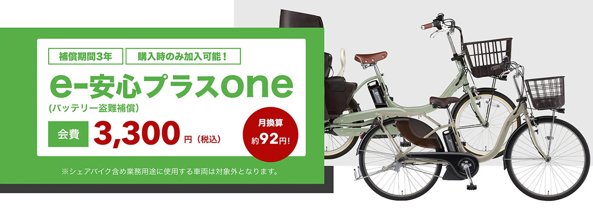 PASバッテリー盗難補償サービス「e-安心プラスone」バッテリーの盗難にあった場合、同型のバッテリーを補償いたします。>詳細